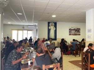 Tras el desayuno, los voluntarios se encargan de limpiar el comedor y de preparar los aproximadamente 200 bocadillos para la cena. La planificación del menú diario comienza temprano, buscando ofrecer una comida completa y equilibrada. Este menú consta de un primer plato, un segundo plato con carne o pescado acompañado de patatas a lo pobre o arroz, ensalada y un postre que suele ser macedonia de frutas o fruta de temporada.